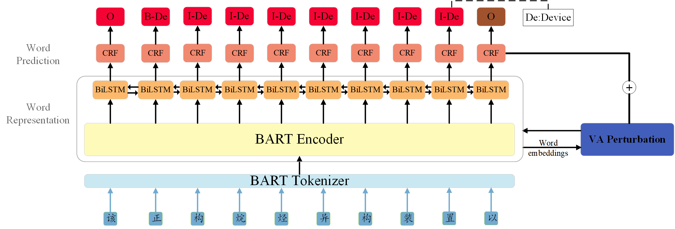生成文本作为增强文本连同已标注文本作用于命名实体识别模型VA-BART。模型的主要结构如图3所示,给定一个输入句子,然后输入到预训练的BART模块中。为了进一步增强上下文建模,在BART计算之后,采用双向LSTM生成最终的单词表示。最后使用条件随机场进行token的预测。为了提高模型泛化性,参考虚拟对抗的机制,我们将其运用到了中文命名实体识别任务中。