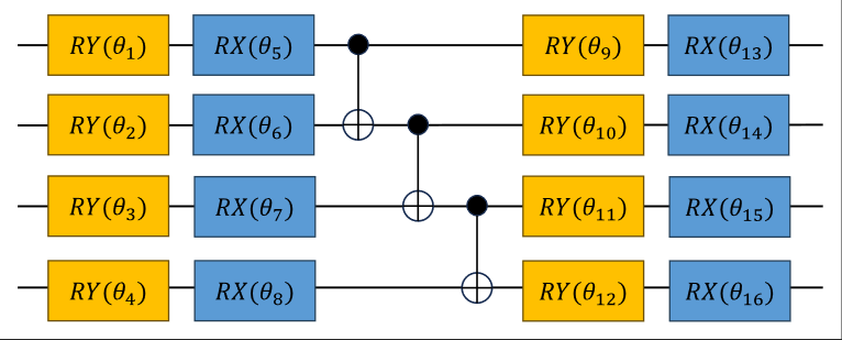 本文所采用的参数化量子线路如图2所示。参数化量子线路由单量子比特旋转门和CNOT门组成,CNOT可以灵活调整以适应不同的硬件架构。这种灵活性简化了线路的布局,降低了门的数量,提高了线路的鲁棒性和适应性。