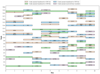 本研究提出了一种基于知识辅助的大规模原油调度与计划集成优化模型,该模型采用了一种结合数学规划(MP)和粒子群优化(PSO)的混合优化算法(MP/PSO)进行求解。长期计划旨在最小化运营和运输成本,同时最大化炼油厂利润;而短期调度则基于初步的长期计划,旨在最小化装置切换次数。在短期调度阶段,基于经验操作知识的启发式规则生成一个高性能的初始种群,以加速收敛。这一策略对于提升炼油厂的应急响应能力、确保稳定运行以及提高经济效益至关重要。实验结果表明,MP/PSO在本文大规模原油调度场景中的表现优于PSO和人工调度。