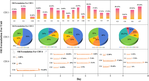将原油调度问题分为两个层次:长周期计划和短周期调度。长周期计划通常考虑的是数周到数月的时间尺度,目标是确定各个加工单元的投入产出量和产品配比,以满足市场需求和生产成本要求;而短周期调度则通常考虑的是数天到数周的时间尺度,目标是在长周期计划的基础上进一步优化各个罐的收付油情况,以确保生产运营的稳定性和效率。因此,在长周期计划优化完成后,可以将优化结果作为短周期调度的初始条件。这样可以提高短周期调度的效率和稳定性,也能够更好地满足生产需求。具体而言,长周期计划模型可以表示为: