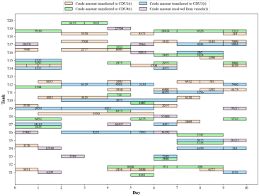 为了验证本方法的有效性以及稳定性,本文针对长周期计划结果设计了多组对比实验。分别用PSO(长周期结果为随机生成)和Manual/PSO(长周期结果为人工排产)与本文所提方法MP/PSO进行对比。图3和图4为求解的长周期计划结果。