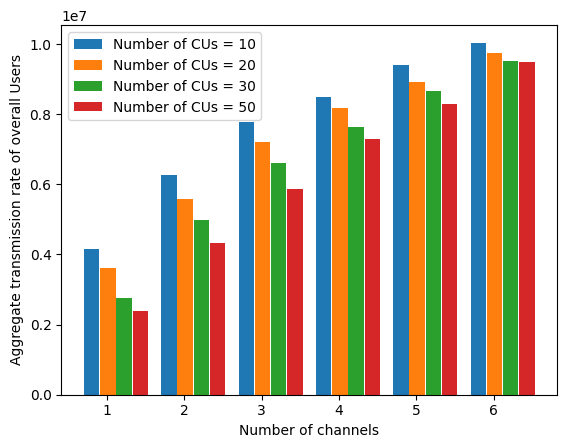 图二显示了CU数量和信道数量对用户总传输速率的影响。