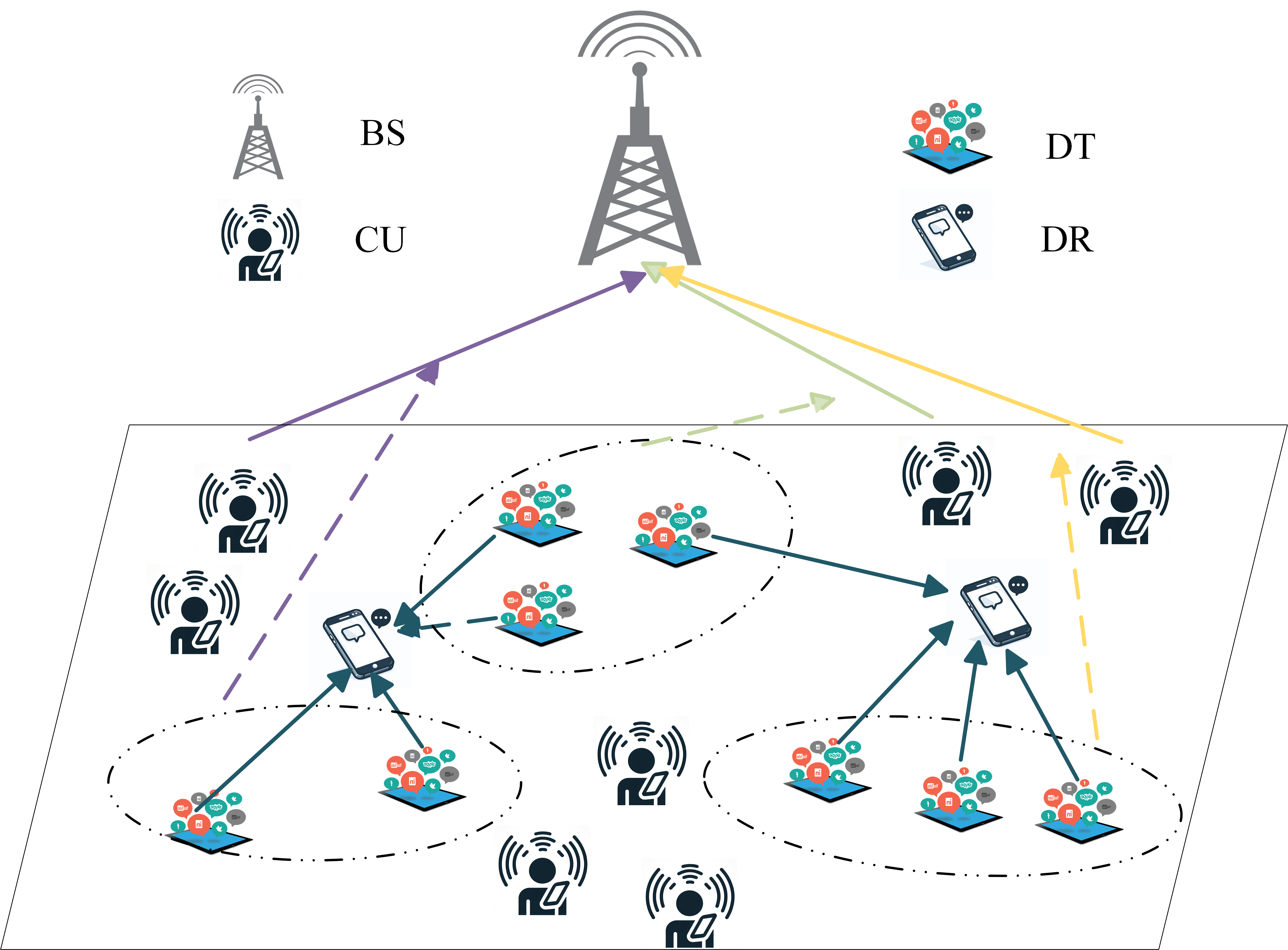 随着移动用户的快速增长,无线连接正经历着指数级的增长。有效利用闲置移动设备可以缓解用户向云端上传数据时造成的传输延迟。在支持设备到设备的蜂窝网络中,用户无需使用基站即可向邻近地区的其他用户传输数据,从而获得无处不在的服务和应用。虽然设备到设备(D2D)用户可以重复使用蜂窝用户信道,但这会使D2D用户受到跨层干扰。合理分配信道资源以减少用户干扰是当前面临的一个严峻问题。此外,用户的位置并不固定,如何灵活选择合适的协作者以保持整个系统的负载平衡也是一个重要问题。这也是D2D用户需要研究的重要问题。