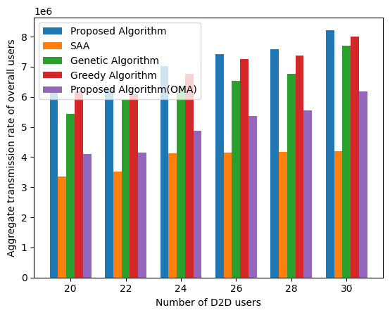图四显示了D2D用户数量与全部用户总传输速率的关系,也对比了五种算法的性能。