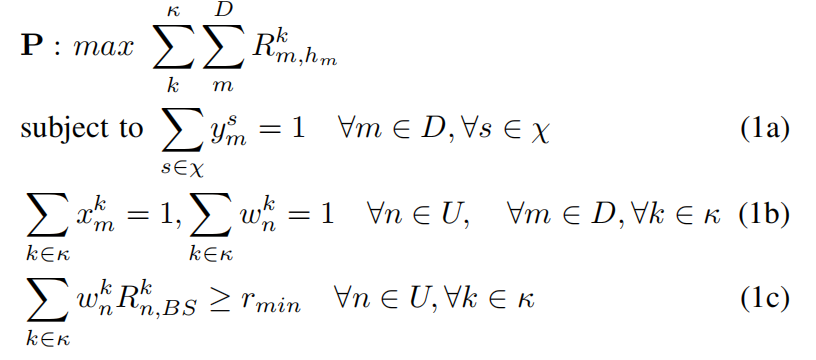 其中,条件(1a)表示每个D2D用户只能选择一个合作者进行连接,条件(1b)表示每个CU或每个D2D用户只能选择一个信道进行传输。约束条件 (1c) 限制了最小数据传输速率。