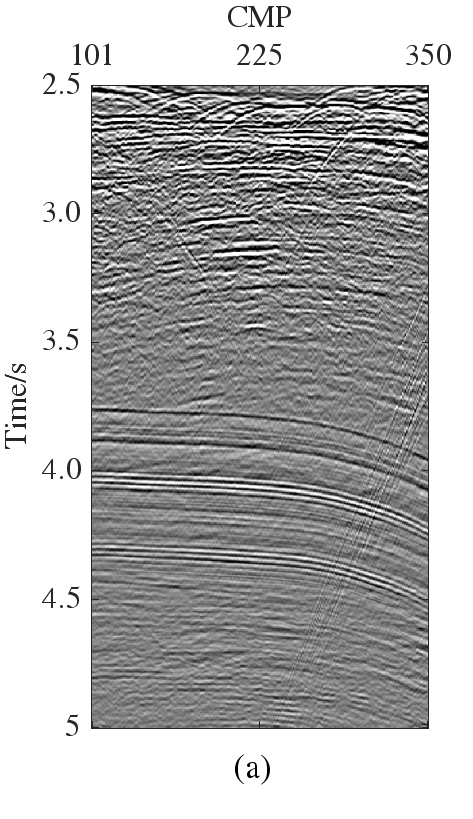 为验证本文方法应用效果,对某实际数据集进行多次波压制实验。图2a是其中一个CMP道集,图2b和2c分别为最小二乘法估计的Radon域系数和本文方法滤波后的多次波Radon域系数。容易观察到,本文方法可对扩散的多次波能量逐渐衰减。