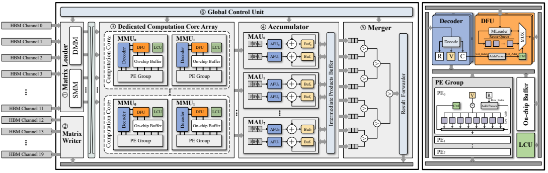 我们精心规划了HBM通道的分配方案,以充分利用内存带宽;专用计算核心阵列中的矩阵乘法单元(MMU)可以跳过稀疏矩阵中的空白结构,以减少冗余的片上内存写入,灵活的重用队列暂存可复用元素,以提高稠密矩阵重用性,设置多个PE组以提高计算并行性;累加器中的矩阵累加单元(MAU)平衡了传输与计算速度,并且支持快速随机读写。