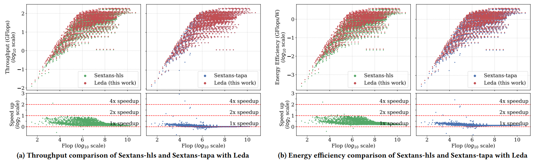 图 5:Leda与Sextans-hls和Sextans-tapa的吞吐量与能效对比