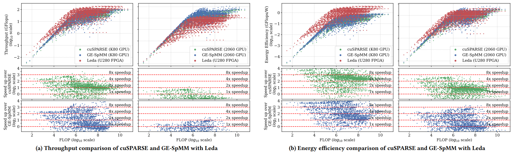 Leda与K80 GPU上的cuSPARSE和GE-SpMM相比,几何平均吞吐量分别提高了1.95倍和1.58倍,几何平均能效分别提高了5.23倍和4.23倍。