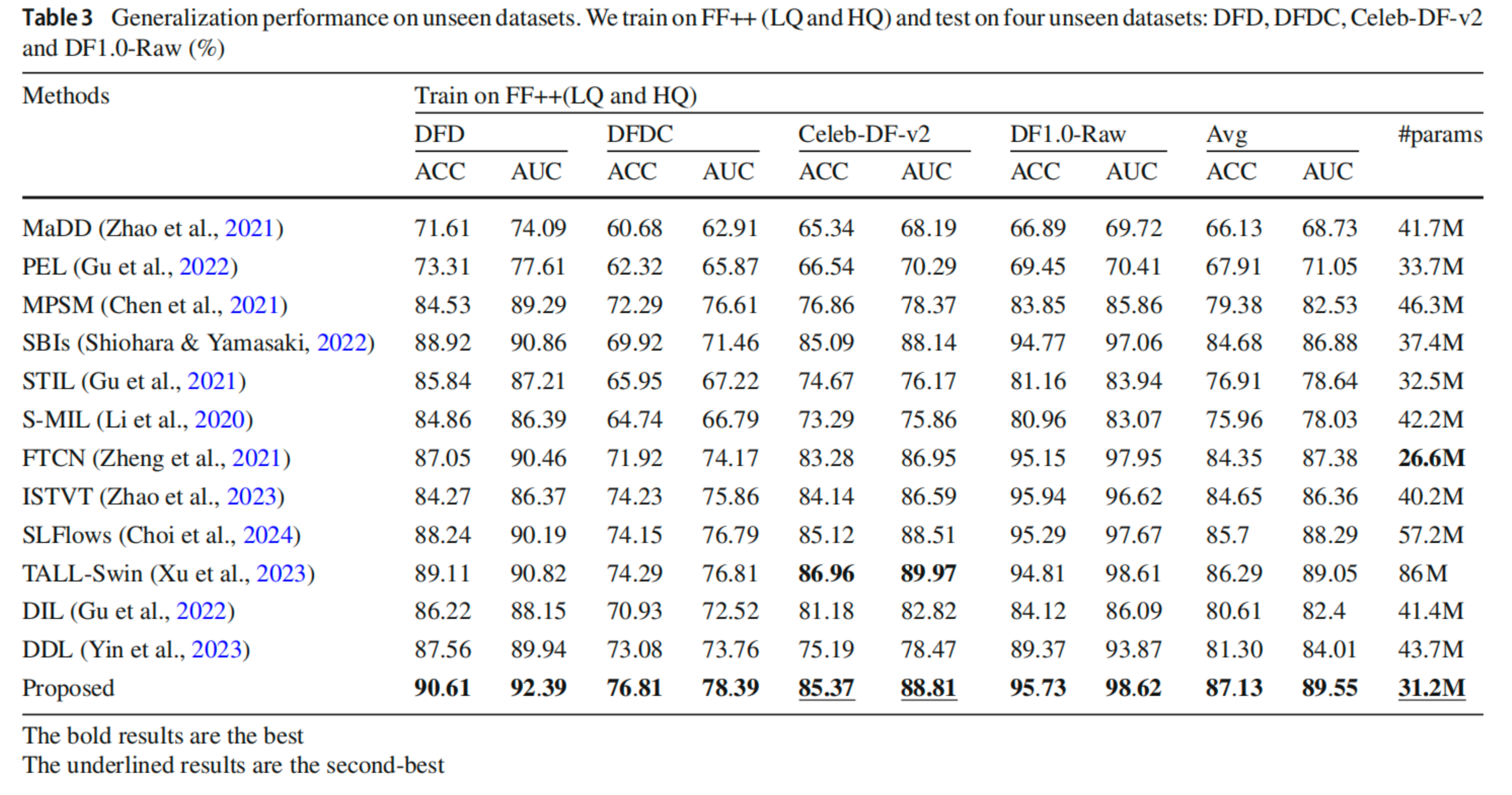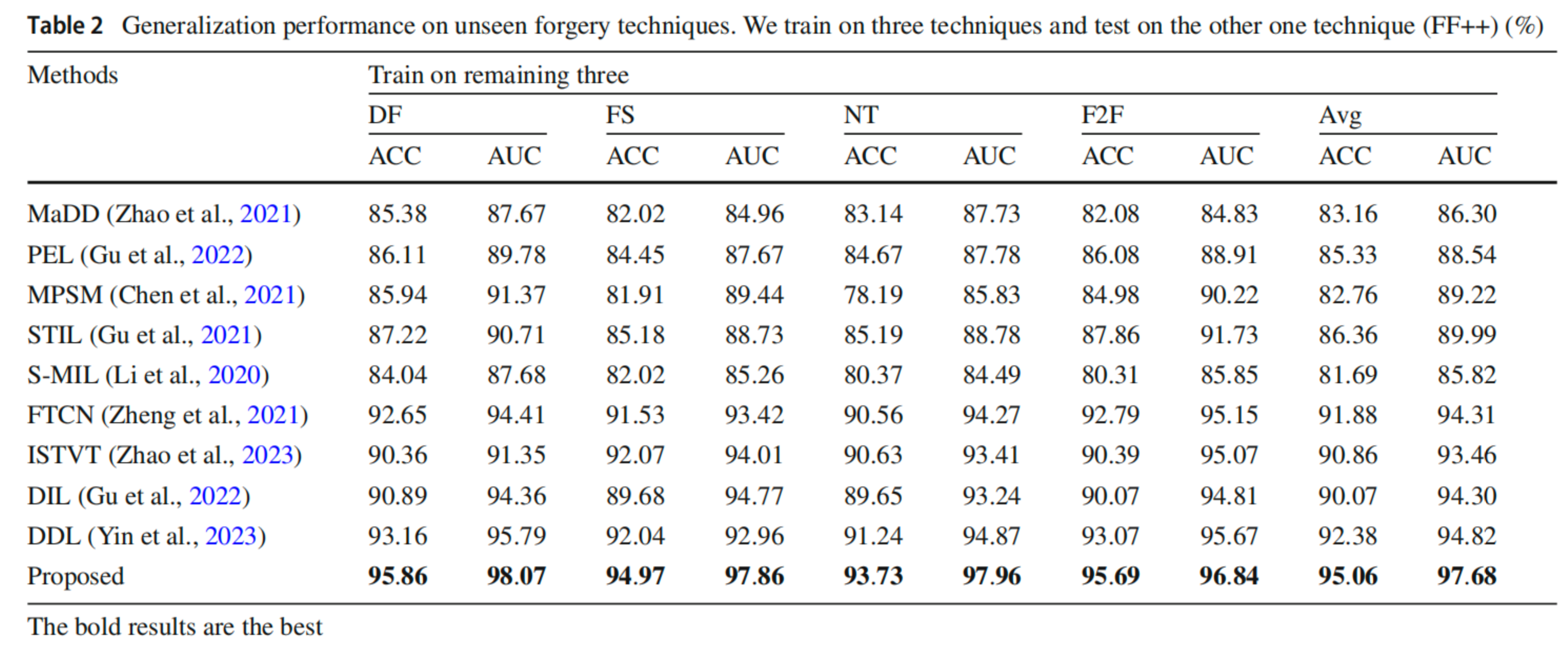 我们进一步评估所提算法在检测未知伪造技术检测方面的泛化能力。在此检测任务中,在FF++数据集中使用留一法策略进行实验,检测准确率可以达到93%以上,如下图。