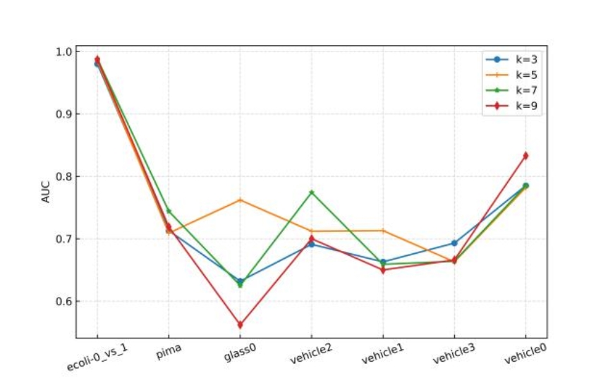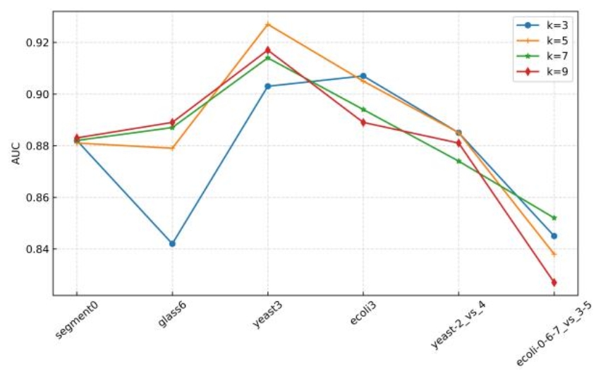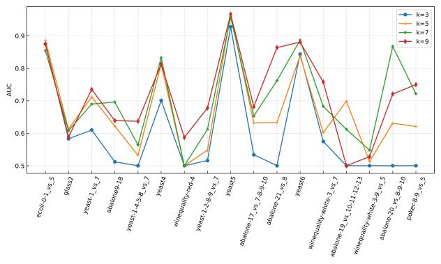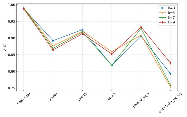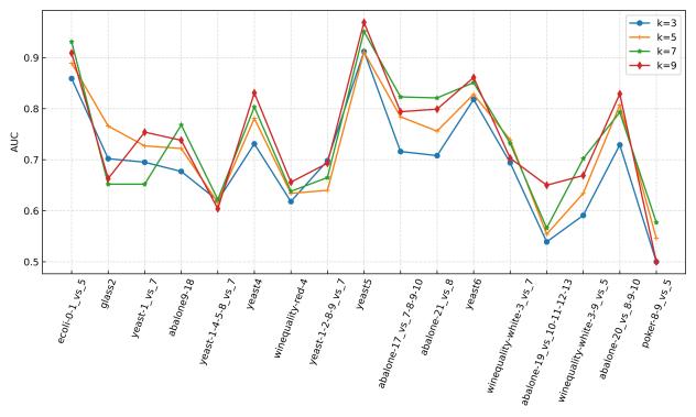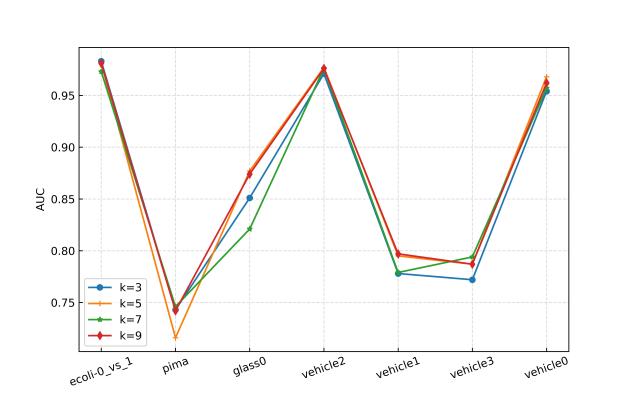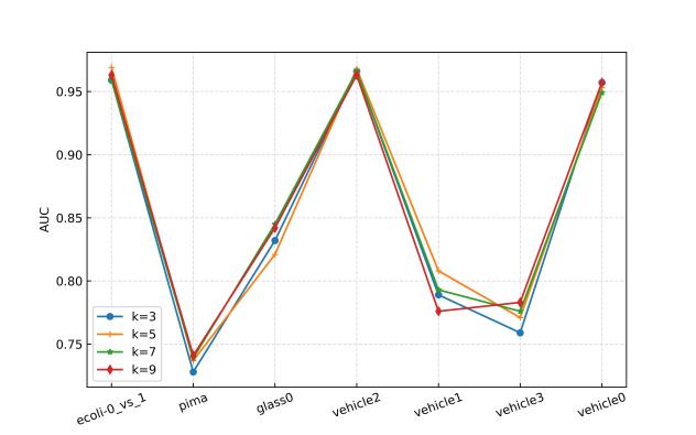 在30个不平衡数据集上进行参数敏感实验,并与其他先进方法进行对比实验,实验结果如下所示。