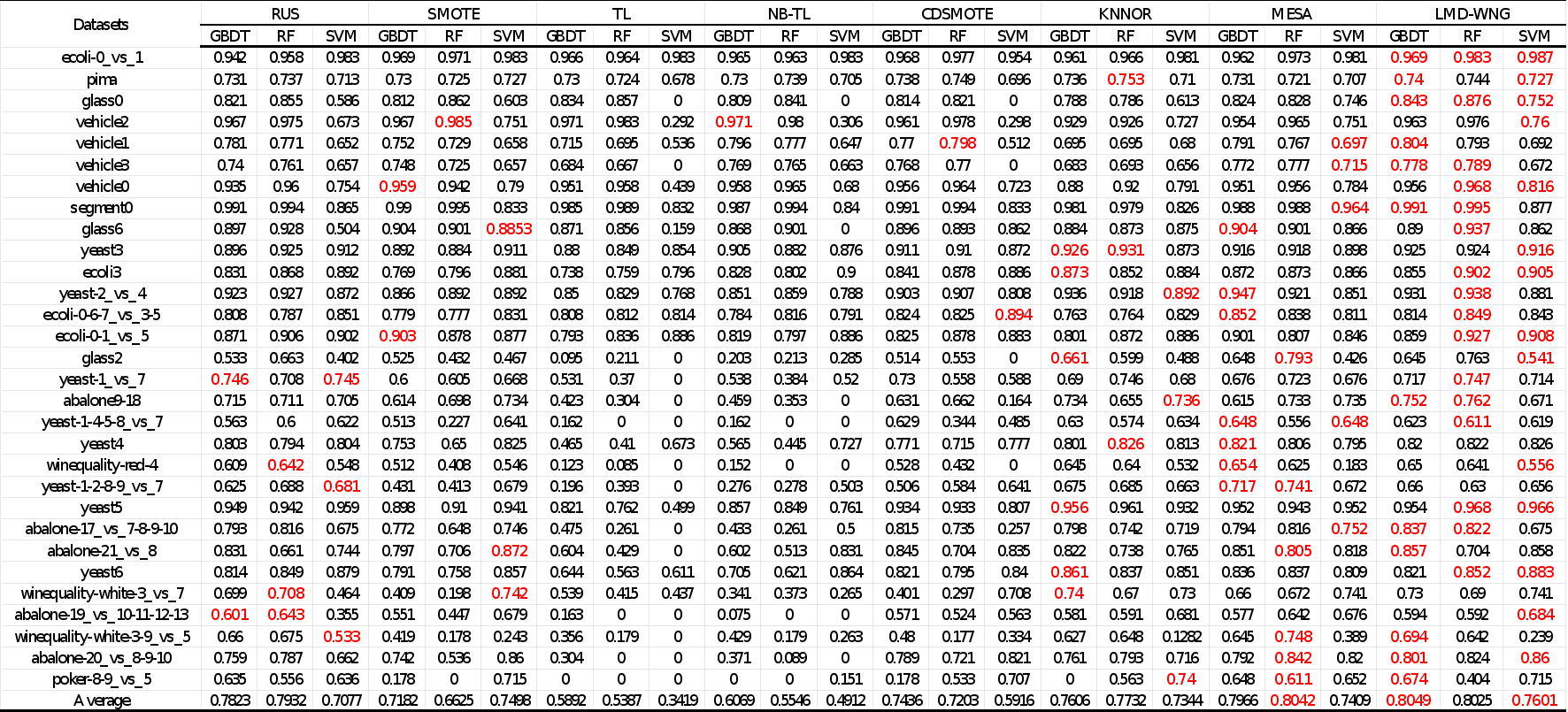 表2 使用G-mean评估模型时的性能结果