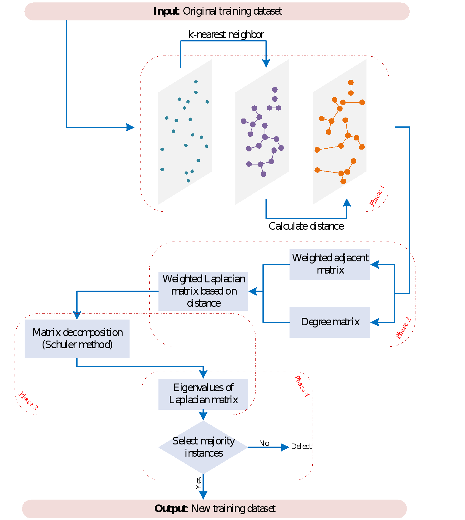 LMD-WNG是一种结合拉普拉斯矩阵和矩阵分解技术的样本选择方法,据我们所知,该方法是首次在类不平衡问题上结合拉普拉斯矩阵和矩阵分解技术的新方法。该方法分为四个阶段:构建k最近邻图、计算标准加权拉普拉斯矩阵、矩阵分解(Schur分解)和样本选择。