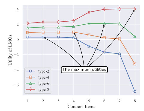 图3显示了本地模型拥有者在选择任务发布者设计的不同契约条目时的效用。