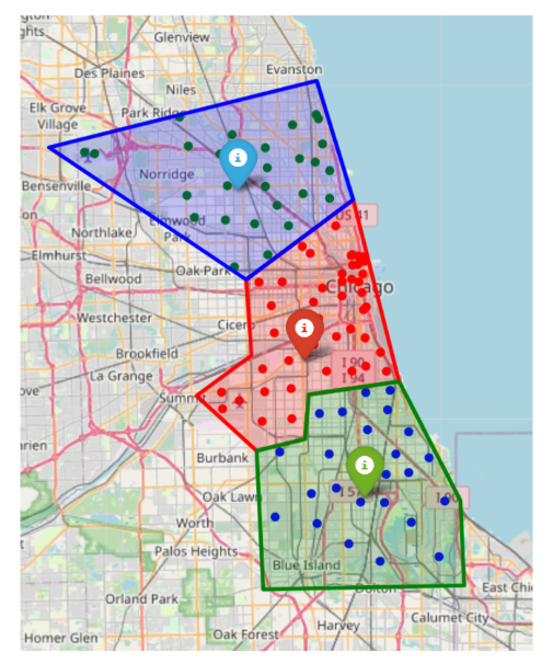 我们设计了大量模拟实验,以评估弱不完全信息情景下契约设计的最优性,以及强不完全信息情景下CDRL的性能。我们利用真实世界的数据Chicago Taxi Trips-2021进行实验。通过使用K-means算法进行区域划分,划分结果如图2所示。