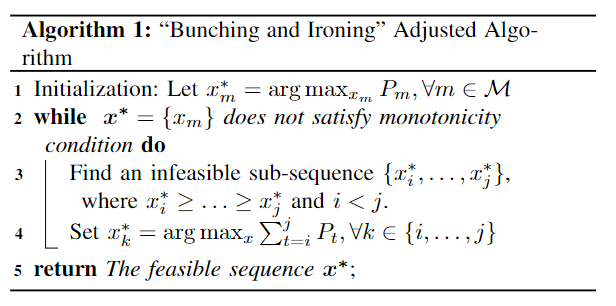 利用凸优化工具,我们可以轻松得出最优契约设计问题的最优解,而无需考虑单调性条件的约束。当本地模型拥有者的概率分布是均匀分布时,解自然满足单调性约束条件。否则,解有可能不满足单调性约束。我们需要进一步检查解的单调性约束,使用“Bunching and Ironing”调整算法来解决不可行子序列问题。