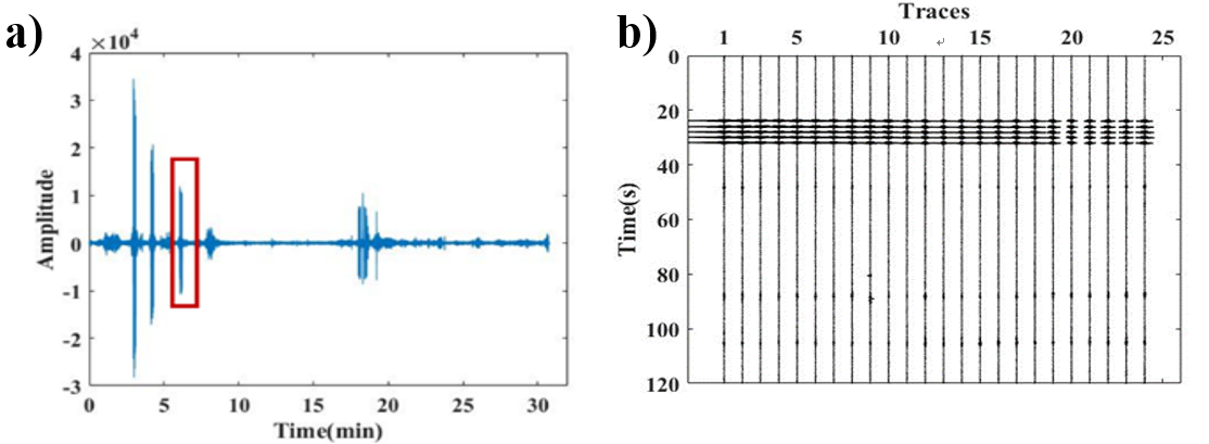 (a) 单个检波器记录; (b) 含有强方向噪声源的地震记录