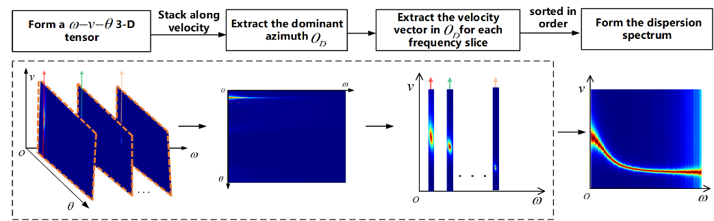 在频率-方位-速度谱中沿主导方位切片提取主导方位下的频率-速度谱,形成最终的频散谱。