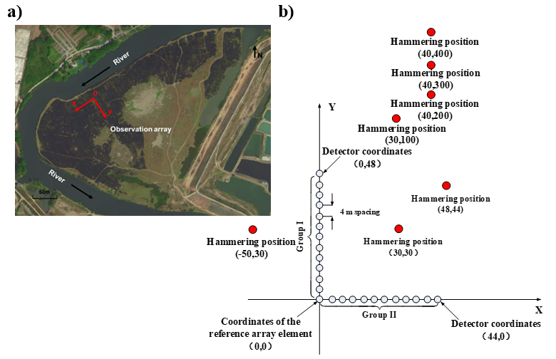 (a) 试验场地卫星图像; (b)观测系统和震源分布情况