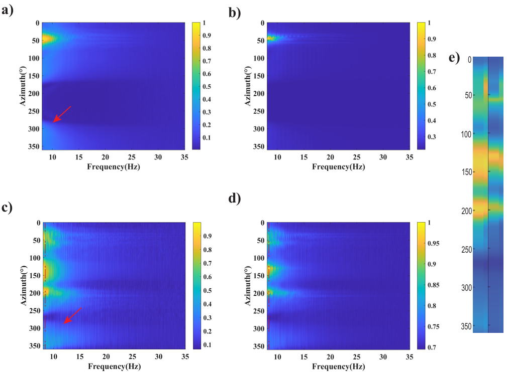(c)和(d)多主导噪声模型下的结果; (e)是在8Hz下从(c)和(d)中提取的方位谱对比