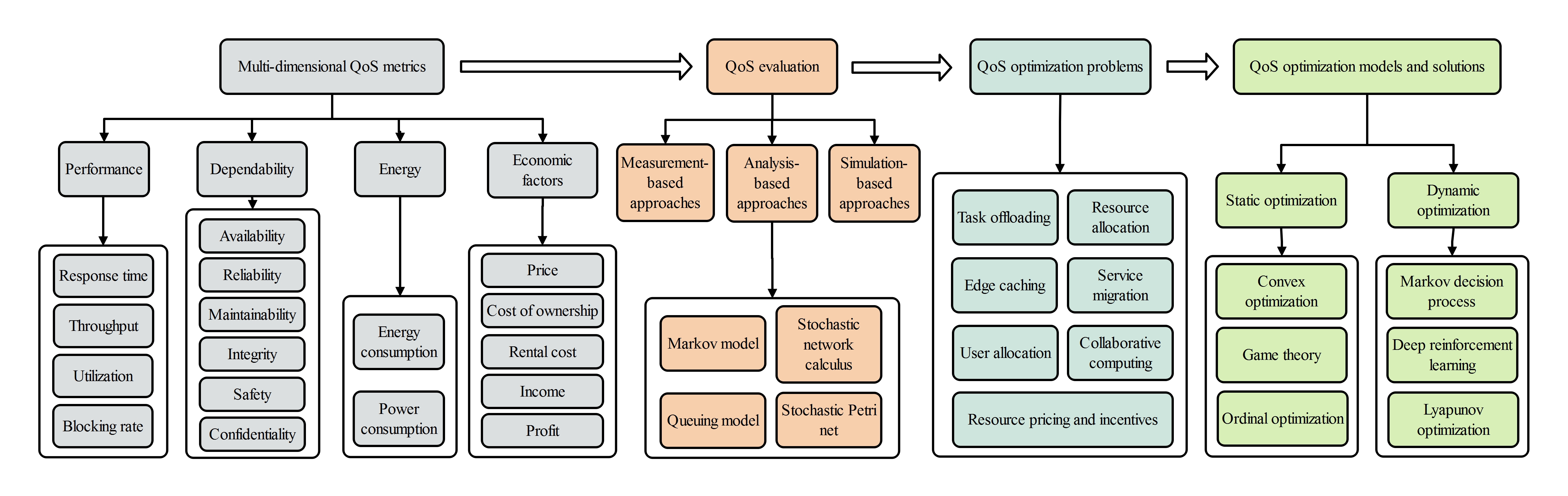 本文对物联网移动边缘计算多维服务质量(QoS)评价与优化的现有研究进行了综述。QoS评价方面,总结了多维多属性QoS指标,介绍了QoS评价方法。QoS优化方面,总结了主要研究问题,介绍了优化模型及相应的解决方案。最后,探讨了边缘智能时代QoS评价与优化相关的新课题和新方法,并讨论了面临的挑战和未来的研究方向。