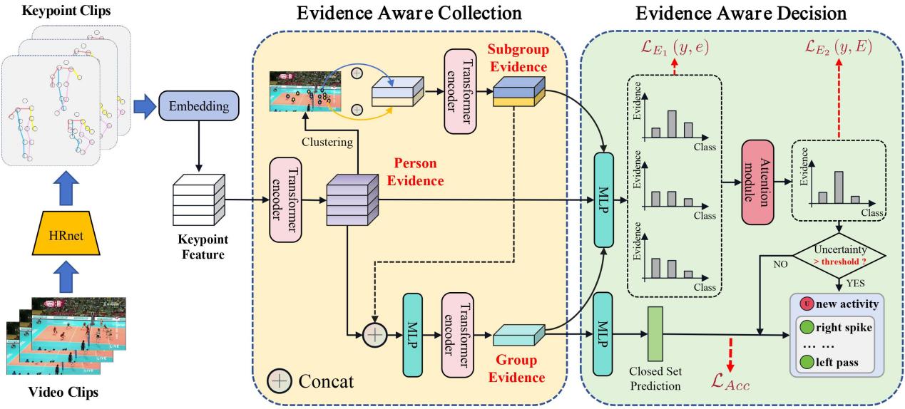 其次在证据收集阶段,要在在解决基于特征推断对样本不确定性估计的影响。该方法将群体活动分解为个体、子群体和整体三个尺度,然后利用证据感知收集方法从每个尺度收集证据特征。在个体水平,将骨架向量组合形成个体特征,并利用 Transformer 提取时间维度批次化的空间演化特征。在子群体水平,利用个体相似性划分子群体,并利用 Transformer 提取子群体特征。最后,将个体特征和子群体特征合并,以获得群体特征表示。在这些阶段中,Transformer 编码器结构都包含多头自注意力机制,能够捕捉同一尺度内不同个体之间的相关性表示,从而提高了模型的泛化能力,最终群体特征计算公式描述如下:
