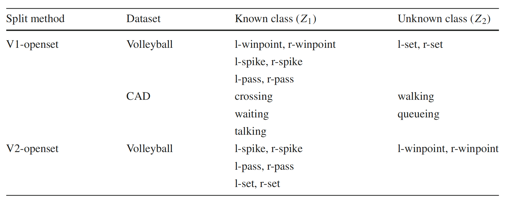 本文依照开集环境要求,对现有对Volleyball数据集以及CAD数据集进行了开集划分如下表1所示。