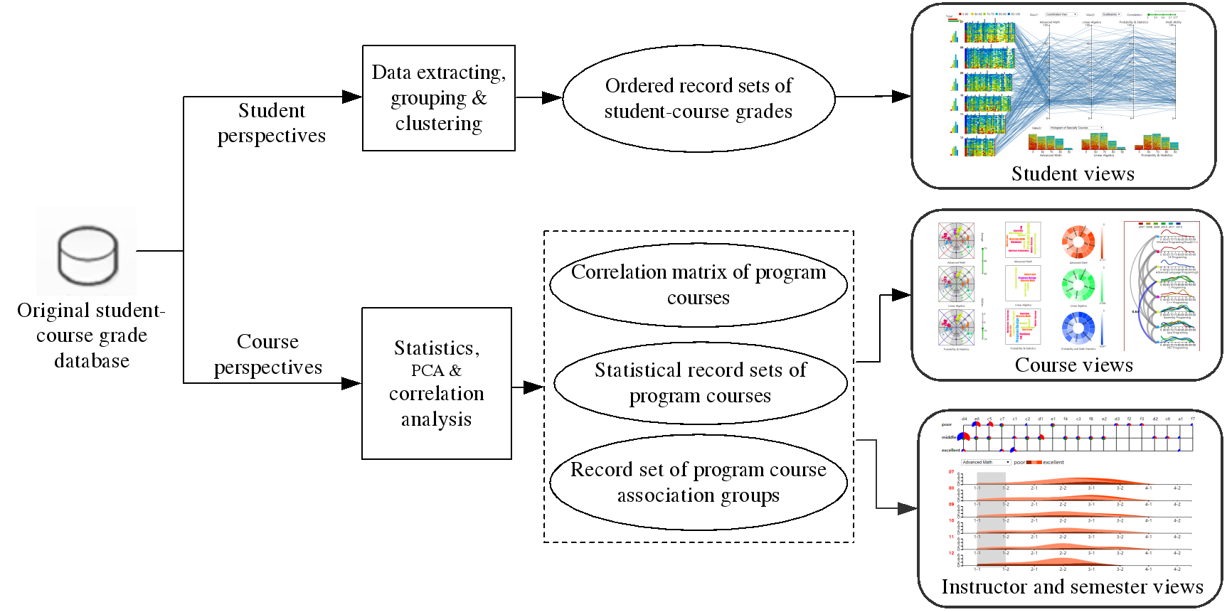 探索大学中重要基础课程对专业课程的潜在影响有助于改进专业教学过程。由于课程门类众多,且成绩受学生、教师、课程本身特点以及上课学期等多种因素影响,采用传统分析方法从单一视角、单个层次难以探索和揭示两者的复杂关系。可视分析技术则能够利用丰富的可视化表达与人机交互手段建立更直观、敏感和有效的关联模型,挖掘多元数据间不易发觉的内在关联模式并分析成因。为此,本文从课程成绩的历史数据分析入手,设计了交互式可视分析系统(MVCAS),用于从多个角度和多个层次展示与探索基础课程与专业课程成绩间的多种相关性。