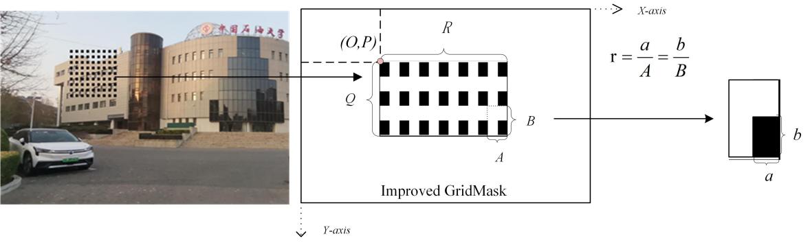 改进版GridMask数据增强方法(如图2所示):针对建筑检测任务中建筑目标面积较大的特点,我们对原版的GridMask方法进行了改进。原始GridMask可能覆盖整个建筑目标,影响模型的特征提取能力。因此,我们提出了将GridMask的分布细化为图像中的随机目标区域的方法。这种方法能够更准确地模拟真实世界中的遮挡情况,因为在实际场景中,遮挡往往集中在图像的特定区域而非整个图像。我们首先按随机比例缩小GridMask,以确保其不会占据过大的目标区域。接着,在图像中随机分布这些缩小后的GridMask,以模拟实际识别过程中遮挡的随机性。
