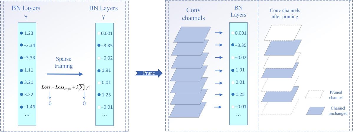 稀疏训练与剪枝(如图3所示):在YOLOv5中,BN(Batch Normalization)层通过引入可学习参数γ和β来增强模型训练效率。当γ和β接近0时,BN层输出趋于0,表明这些通道对网络贡献较小。根据刘壮等人的理论,稀疏训练利用L1正则化惩罚BN层内的反向传播梯度,使γ和β值趋近于0,减少剪枝对性能的影响。基于稀疏训练训练,我们剪枝具有较小γ和β值的通道及其对应的卷积核,之后对模型进行微调以补偿剪枝带来的性能损失。YOLOv5中BN层的密集分布使其成为模型优化的关键。剪枝这些层能有效减小模型大小,且大多数BN层与前后卷积层通道一一对应,允许直接剪枝对应通道,进一步简化模型结构。