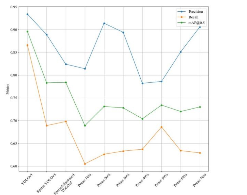 在图5中,实验结果表明,该模型在40-50%的剪枝率左右达到了最低的精度。这表明剪枝率和模型性能之间存在非线性关系。此外尽管剪枝有效地减少了参数的数量,但会导致模型的检测能力下降。此外,即使在微调之后,稀疏训练还是会降低模型的检测能力。这表明微调对恢复模型精度的影响是有限的。