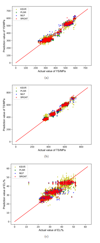 图3 不同模型下测试样本的预测散点图。(a) YS, (b) TS, (c) EL