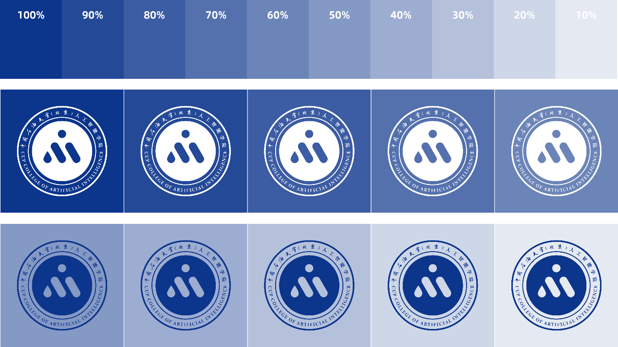 人工智能学院宣传标准色包含蓝、白、黑三色。其中蓝色采用PANTONE19-4052(RGB:12-53-140 CMYK:100-90-15-0);白色为纯白(RGB:255-255-255);黑色为纯黑(RGB:0-0-0)。