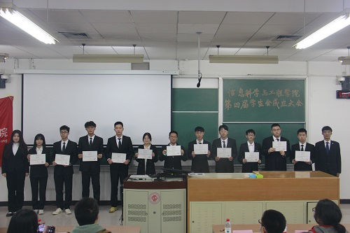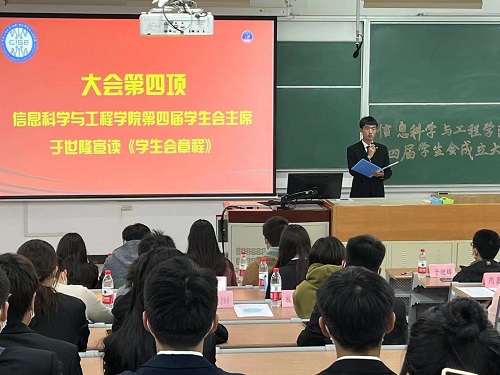 10月16日晚,信息科学与工程学院第四届学生会成立大会在三教106教室召开,学院党委副书记于迎辉、团委书记代莉莎、各社团指导教师、学校及兄弟学院学生组织代表和学院第四届学生会全体成员参加成立大会。