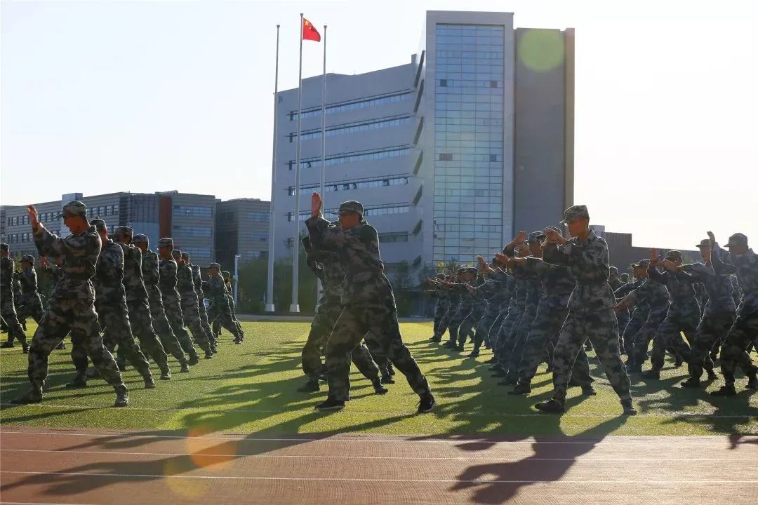 在克拉玛依校区的红旗操场上新生认真参加入学军训