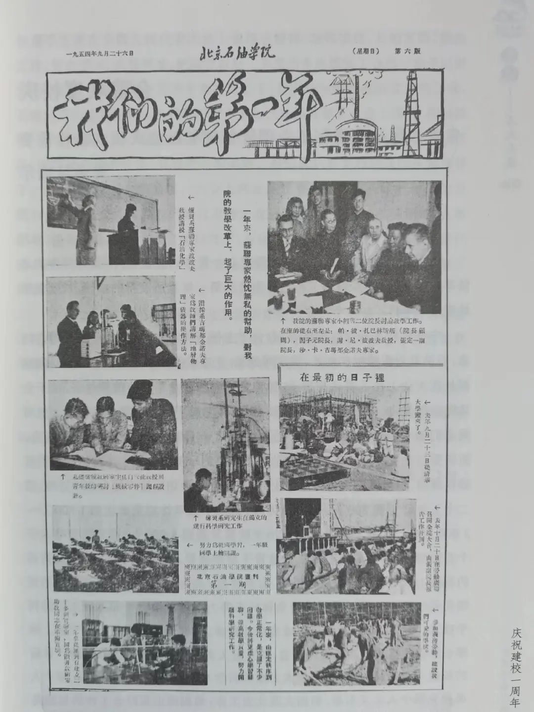 1954年9月26日是北京石油学院成立一周年的校庆,为了迎接这一天,全院师生提前做了很多准备工作。学院举办图片展介绍这一年的教学成就和同学们学习生活的情况。当日下午大家以兴奋的心情参加庆祝大会,在得到中央燃料工业部及石油总局领导对学院一年来成绩的祝贺后,师生、员工们备受鼓舞,充满信心以更大的努力完成新学年的任务。