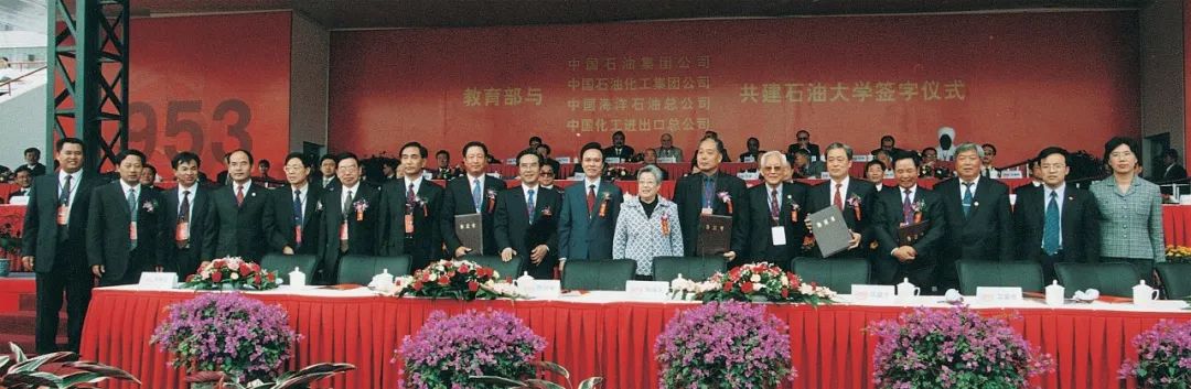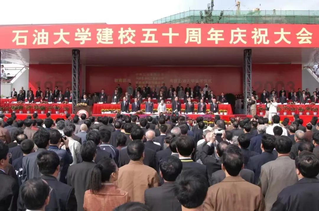 2003年金秋10月,石油大学迎来五十周年华诞。10月2日及4日,石油大学建校五十周年校庆活动分别在北京昌平和山东东营两校区隆重举行。这是石油大学发展史上的一个重要里程碑,也是我国高等教育界的一大盛事。当军乐团高奏国歌,2000只鸽子飞向湛蓝的天空,遍布会场的彩色气球从会场四面冉冉升起,校园顿时成了欢乐的海洋。大会上,教育部与中国石油天然气集团公司、中国石油化工集团公司、中国海洋石油总公司、中国化工进出口总公司等四大企业集团签署了共建石油大学的协议,支持帮助学校为国家能源建设作出更多贡献。这也是由教育部与企业、行业集团共同办学的新举措。