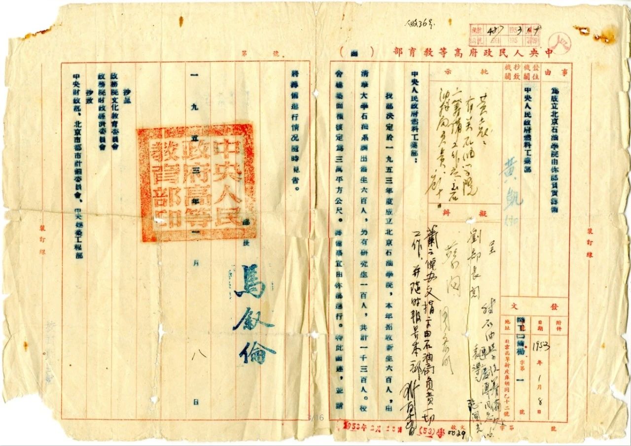 1953年1月8日,高等教育部致函燃料工业部,要求其负责筹备北京石油学院。