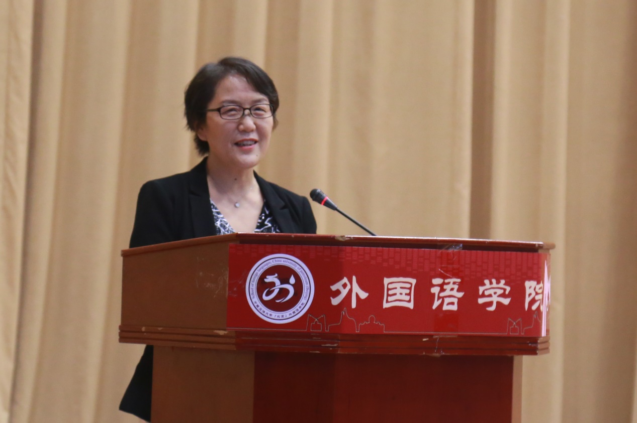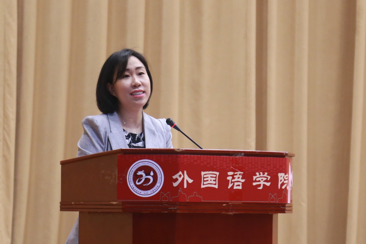 外国语学院院长赵秀凤教授致辞。赵院长首先对2020级新生表示热烈欢迎。赵院长表示,疫情之下,这届新生遭遇了前所未有的严峻考验,但众多抗议过程中涌现的英雄始终鞭策着、激励着同学们勇往直前。与此同时,赵院长对这届已经经历过风雨的大一新生充满信心并给予充分的肯定。深处百年未有之大变局时代,国家面临前所未有的挑战,因此赵院长对新一代青年人寄予厚望,鼓励同学们突破“小我”,构筑“大我”,为祖国助力。此外,赵院长对作为中外语言建设的青年人提出要求:既要有世界视野,又要有家国情怀;用语言作为武器去打拼在国际战场;用语言在国家和世界之间搭建桥梁;用语言讲述中国故事,传播中国文化;用语言传播智慧,成就梦想。最后,赵院长鼓励同学们大学里的每一天,都要用坚定的信念,用实际的行动,汲取力量,成就梦想,报效国家。