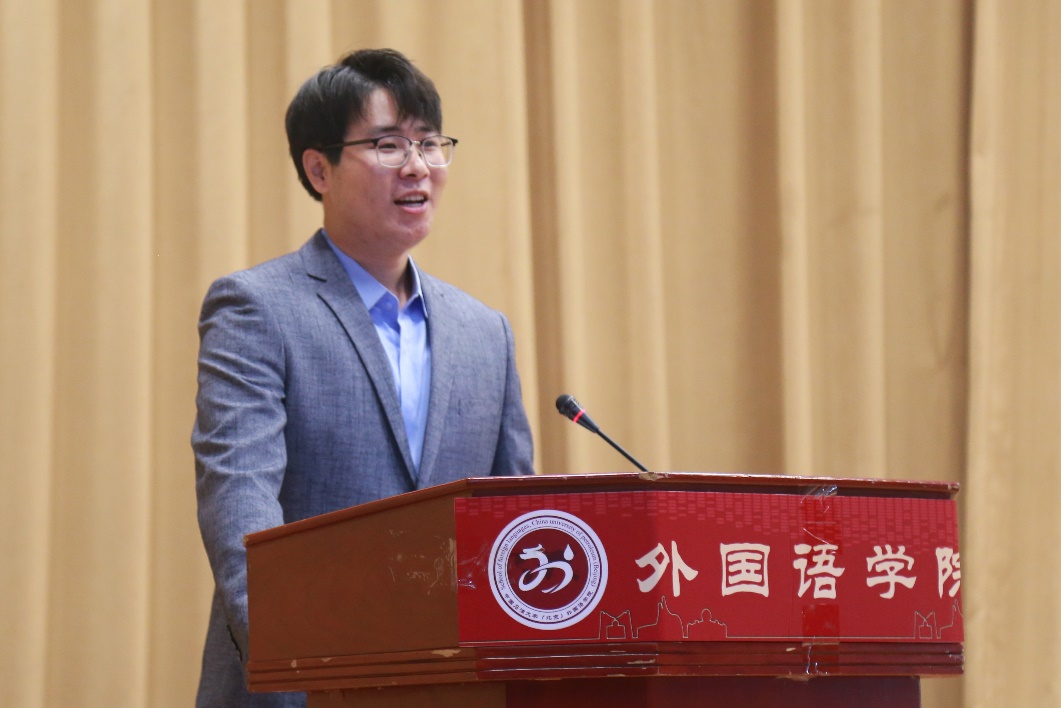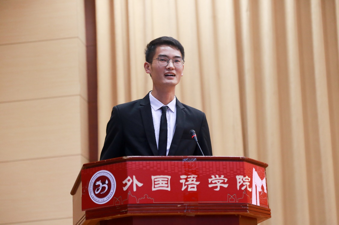 研究生新生代表2020级硕士研究生杨哲同学发言。杨哲同学感慨本科四年外国语学院对他的巨大帮助,今后作为一名研究生会更加以严格的标准要求自己,以实际行动报答学院老师的辛勤栽培,为学院贡献自己的力量。最后,在外国语学院20岁生日之际,杨哲同学向学院表达了美好的祝愿。
