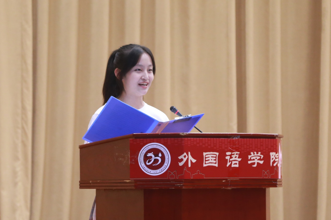 本科新生代表2020级2班阎亭琳同学发言。阎亭琳同学向大家郑重承诺:即使疫情肆虐,也依旧满怀热情迎接大学生活。此外,她表示外国语学院大家庭给予大一新生们关怀与温暖,并立志要发扬集体精神,互相监督,齐头并进。同时,阎同学认为在外国语学院学习会收获良好语言能力以及完善的人格,因此要珍惜大学时光,秉承校训院训,勤奋严谨,明德笃行。
