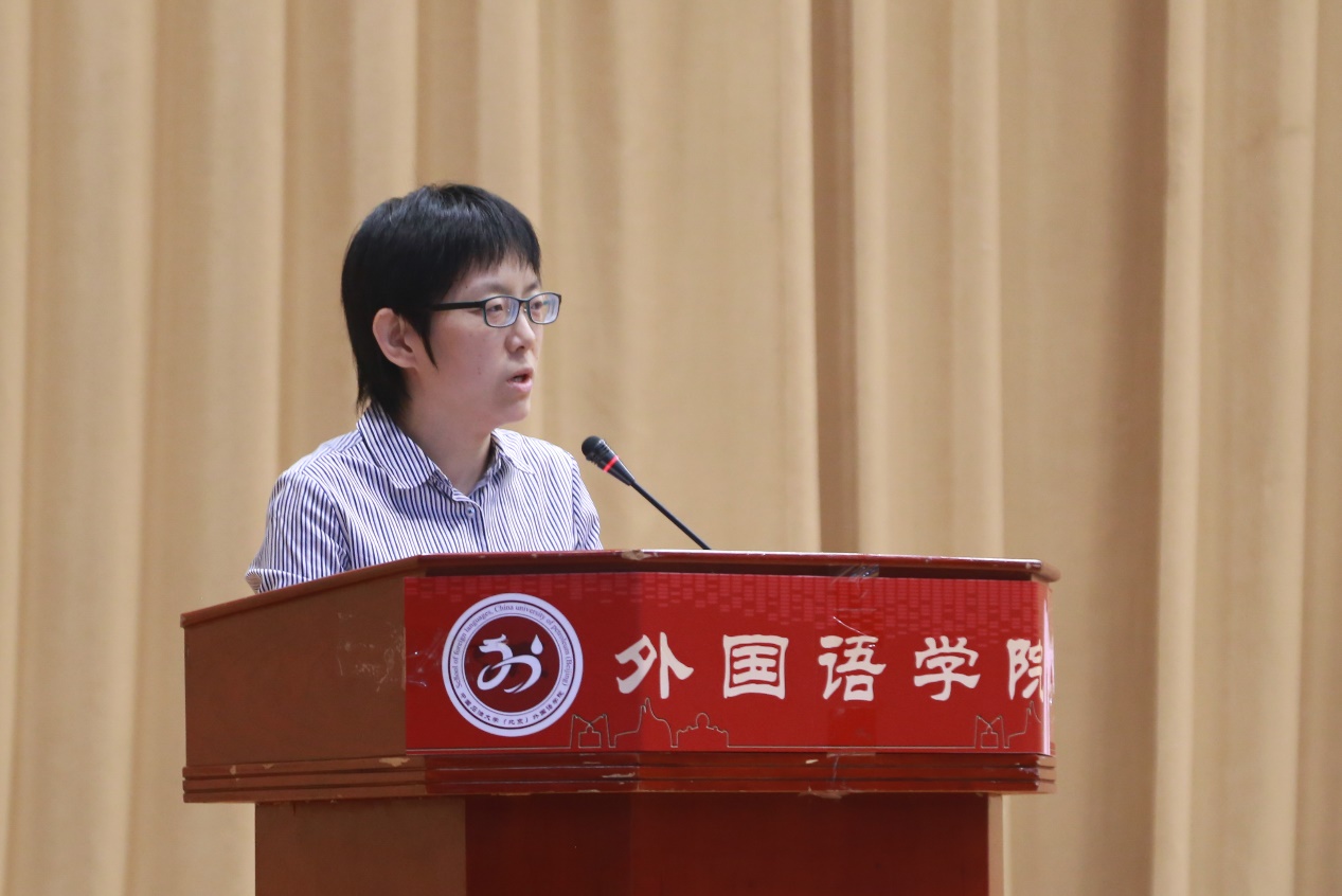 外国语学院唐萌萌老师作为教师代表发言。唐老师向同学们介绍了外国语学院充满活力,拥有一流的教师队伍,是学生成才的快车道。在这里,学生可以掌握各种实际技能,成为拥有国际视野的复合型人才。此外,唐老师希望同学们可以尽快适应大学生活,培养语言能力,全面发展,善于解决困难、抵制诱惑,做好学习规划并合理利用时间。最后,唐老师表示全院老师都将作为学生们坚强的后盾,永远与同学们携手并进。