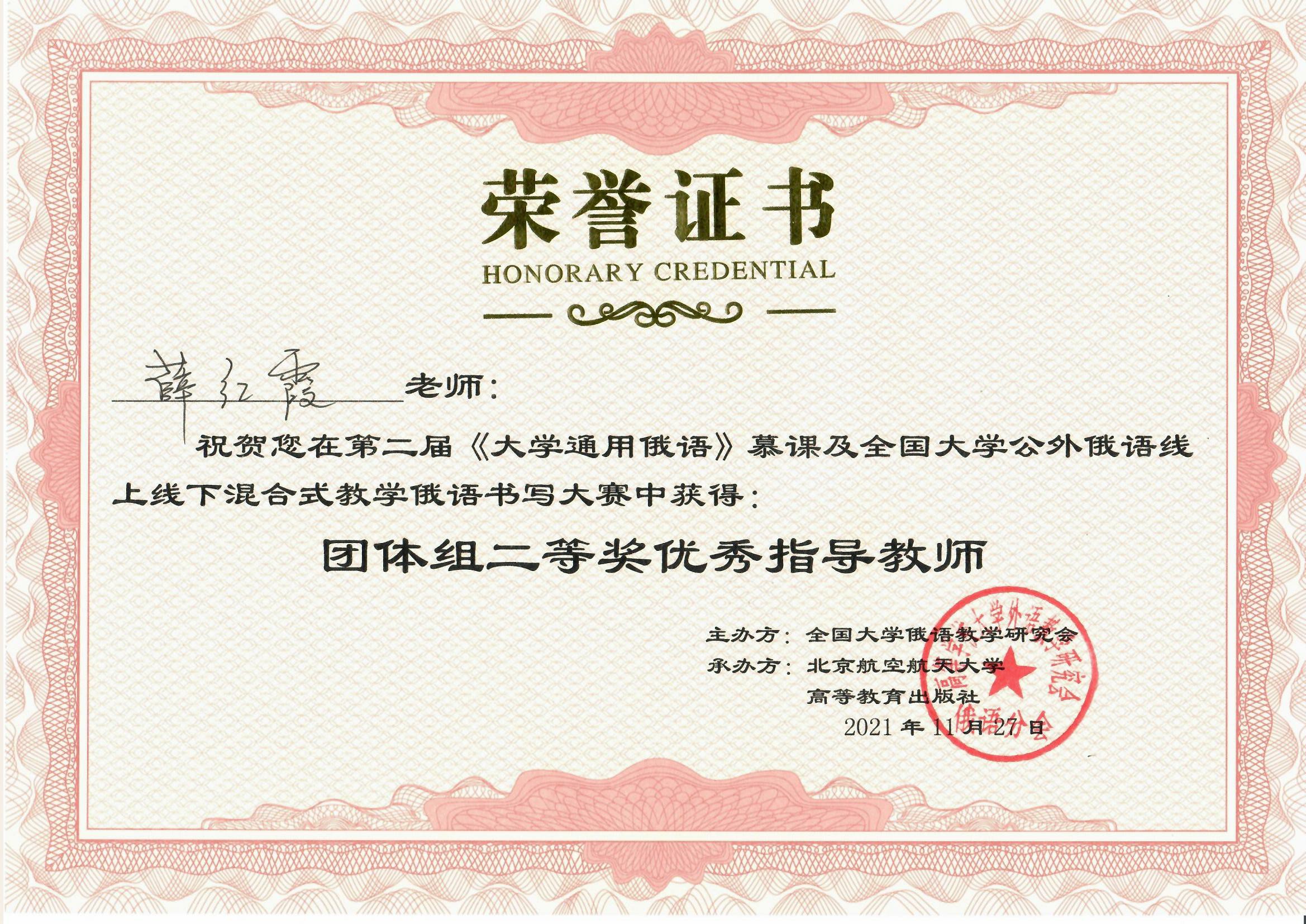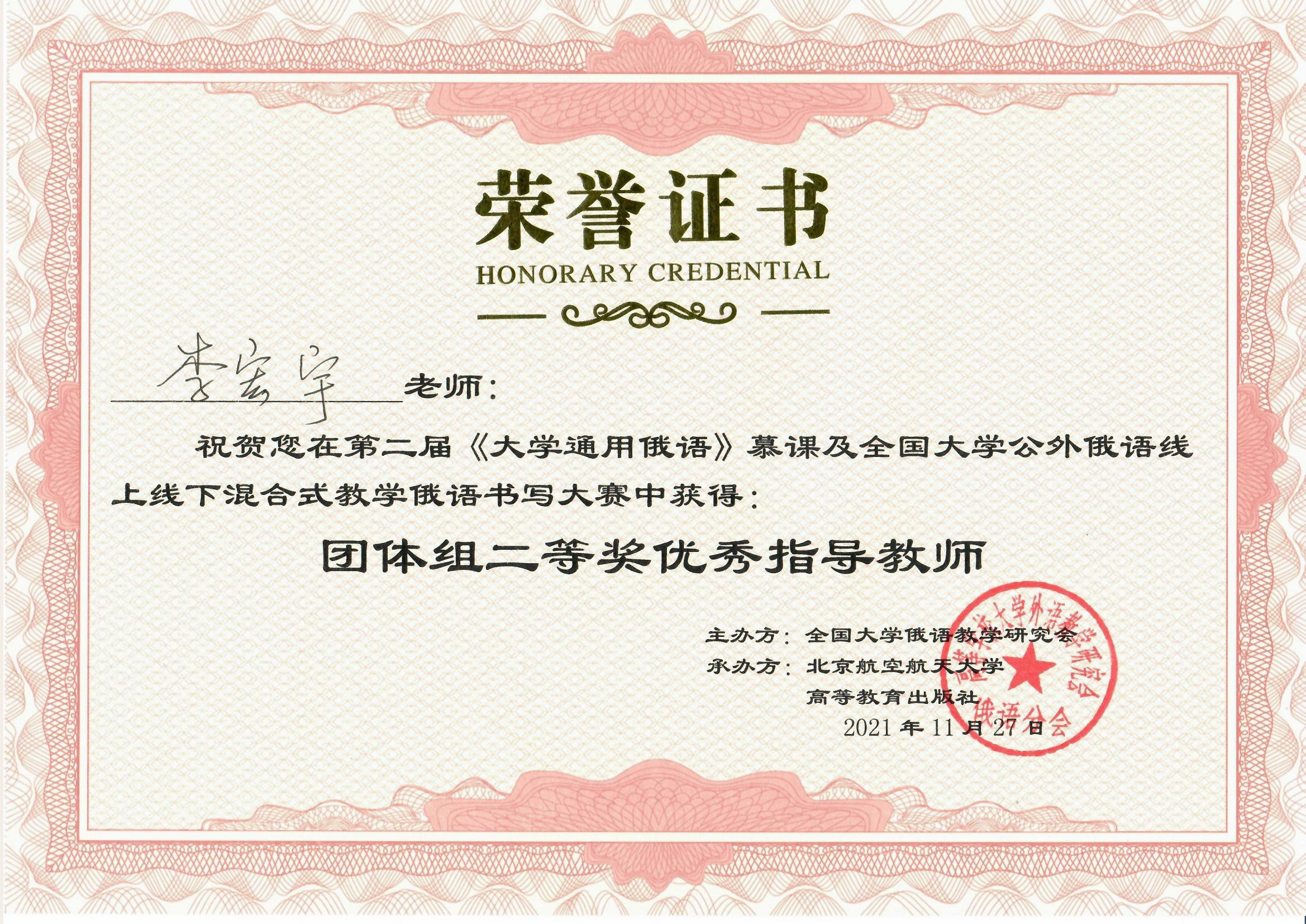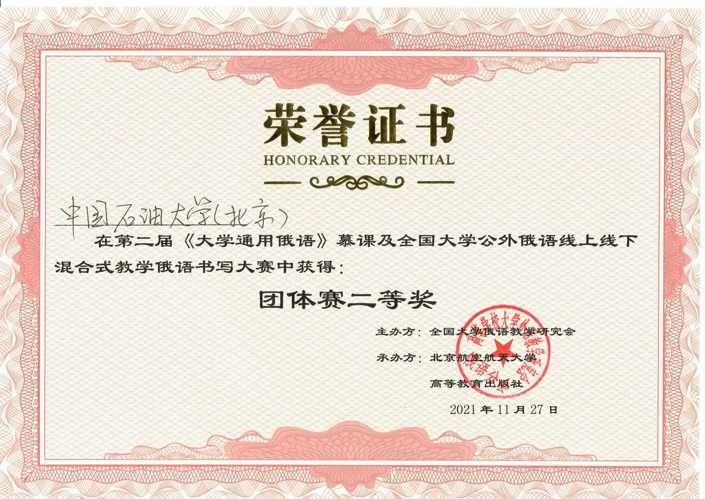 2021年11月27日,中国石油大学(北京)在第二届《大学通用俄语慕课》及全国大学公外俄语线上线下混合式教学俄语书写大赛中再获佳绩,荣获团体组二等奖,四名同学获得个人赛奖项,外国语学院薛红霞老师,李宏宇老师被评为优秀指导教师。