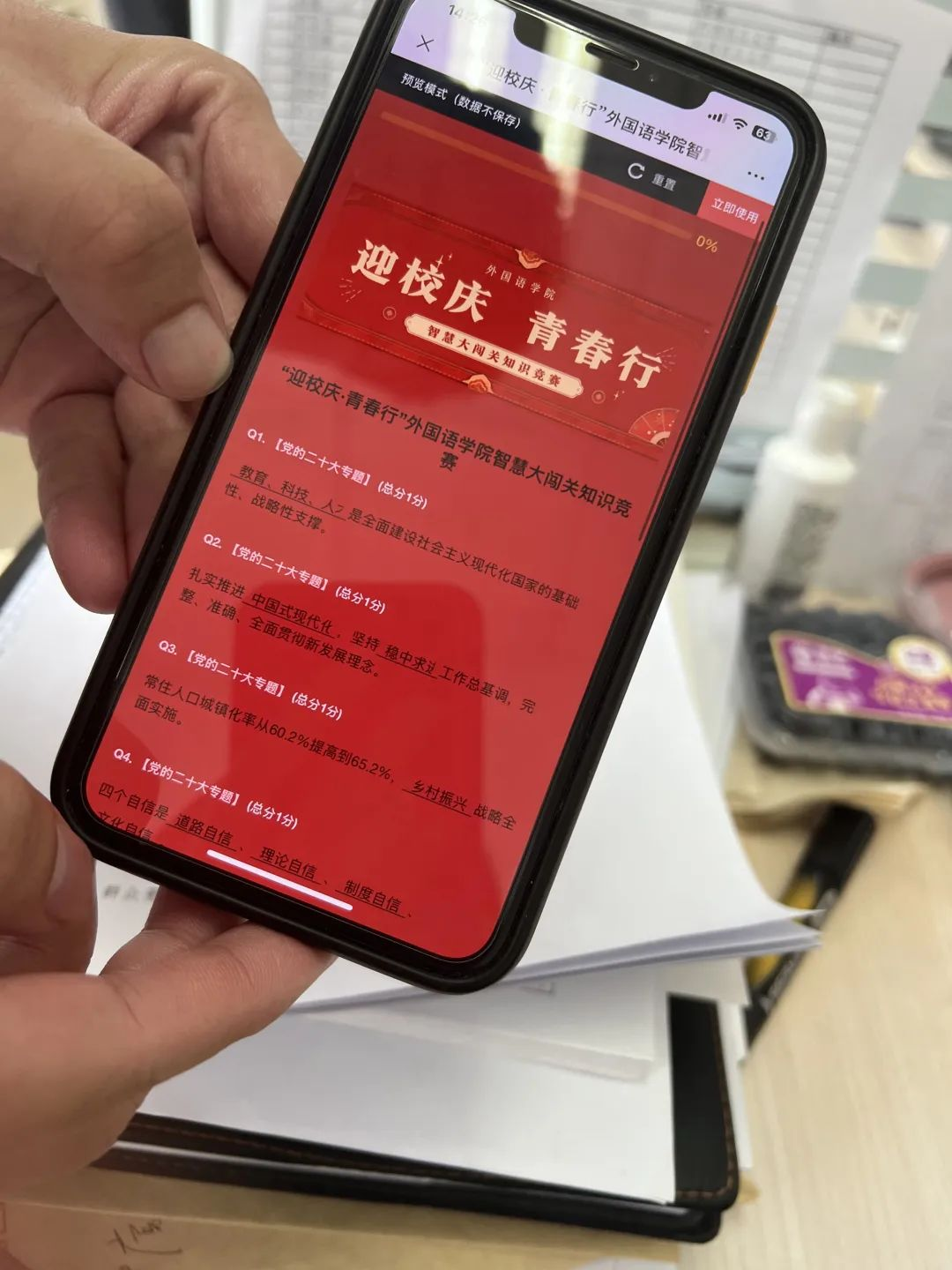 借喜迎校庆之机,以历史为底蕴,以青春为内核,外国语学院于4月10日-14日面向全院学生组织开展以“迎校庆·青春行”为主题的知识答题活动。此次知识答题活动将党的二十大精神、全国两会精神,以及校史相关题目与英语学科特色相结合,共设立70道学习题目。