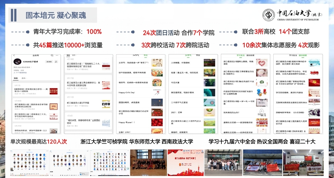按照本年度学院团校的统一部署安排,外国语学院面向各团支部的广大团员开展了线上线下相结合、集中学与自学相结合的学习环节、素质拓展与志愿服务的实践环节,旨在全面提升青年团员的能力与综合素质。学院团委书记讲团课,在思想上和精神上定标定航。专题学习活动丰富多彩,展现了青年团员的蓬勃朝气。专题学习的主题分别为“党的青年运动史”、“建团100周年大会精神”、“新时代的伟大成就”、“党的二十大精神”。通过以上专题学习活动,各团组织积极向党看齐,坚定了永远跟党走的信念。