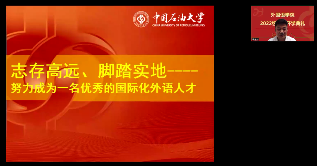 李玉财书记围绕“生逢盛世,肩负重任”和“百年未有之大变局”的主题,为同学们讲授了一堂丰富深刻的思政课。他讲到,面对并存的机遇和挑战,要不忘初心,坚定“四个自信”。并从学校发展历史、人才培养、世界排名和就业现状等方面向新生介绍了校院的基本情况。最后,李玉财书记寄语新生同学要德智体美劳全面发展,努力做有家国情怀,有全球视野,有专业本领的复合型人才。
