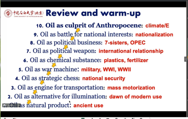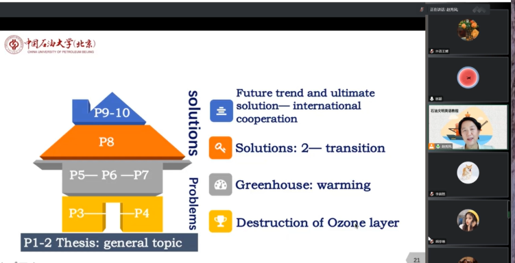 课程伊始,赵教授用清晰明了的PPT,引导学生思考整本书的逻辑框架,在概括前九章内容的基础上,很自然地引出新课第十章的主题。这种温故启新的导入新课模式令人眼前一亮。接着,赵教授点评学生关于“石油对环境影响”的汇报内容,引导学生思考,从石油对自然环境的影响,拓展到石油对社会文明形态等社会环境的巨大影响;鼓励学生能够在学习语言的基础上,扩大自己的视野,多元化深度思考现阶段石油、天然气等能源所发挥的作用,并引入了“能源人文“这个新兴的跨学科研究领域。接下来在课文讲解的过程中,从宏观到微观,从整体到细节,每个层面,赵教授都循循善诱,按照设计好的思路,一步步地引导学生主动思考,处处体现启发性教学,授课互动性非常强。在赵教授循序渐进的引导下,学生们充分发挥了主观能动性,课堂气氛十分活跃。此外,全程采用全英文教学,极大提升了学生们的英语听说能力。