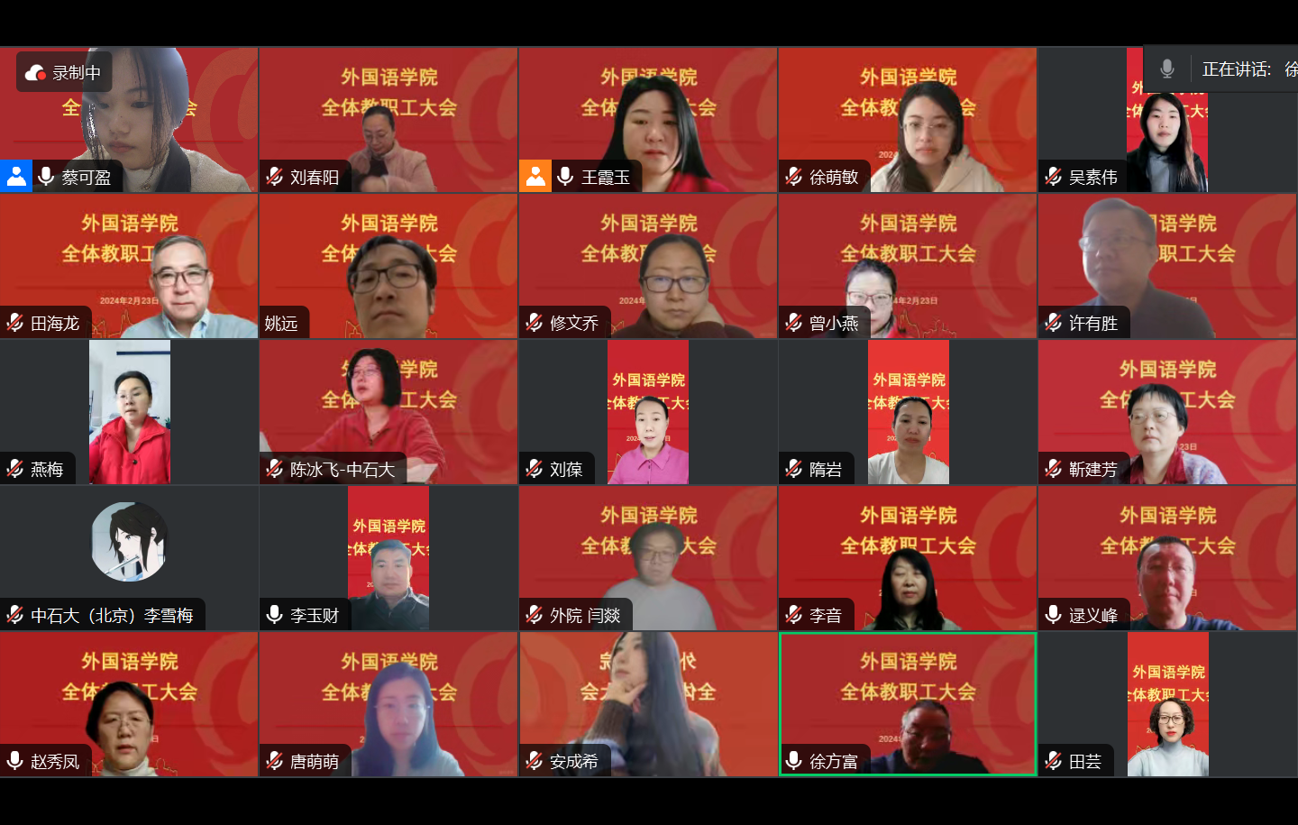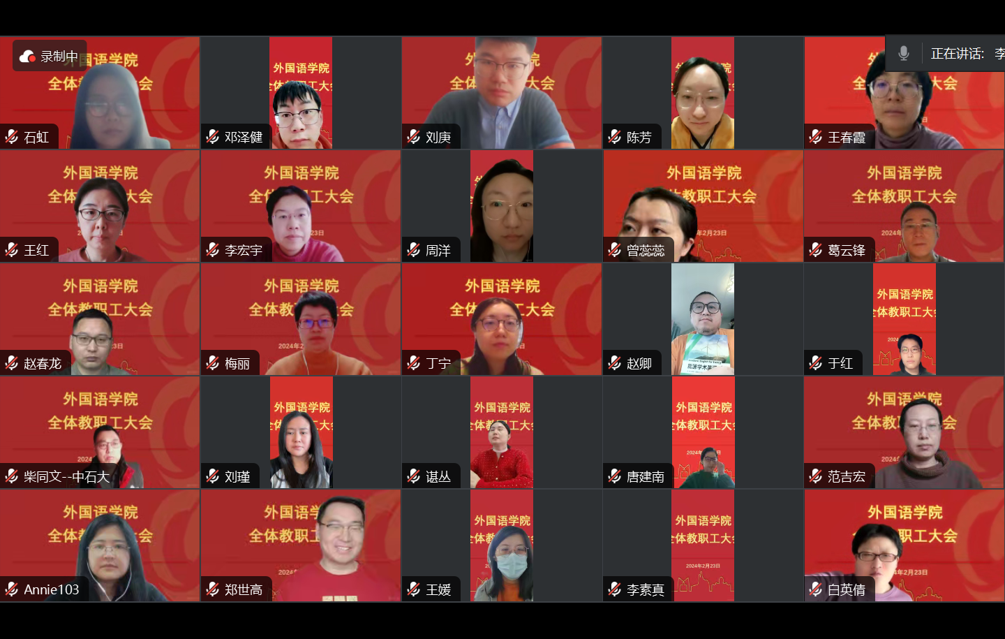 2月23日上午,外国语学院2024年春季学期开学初全体教职工大会于线上召开,学院领导班子成员及全体教职工参加会议,会议由学院党委书记李玉财主持。