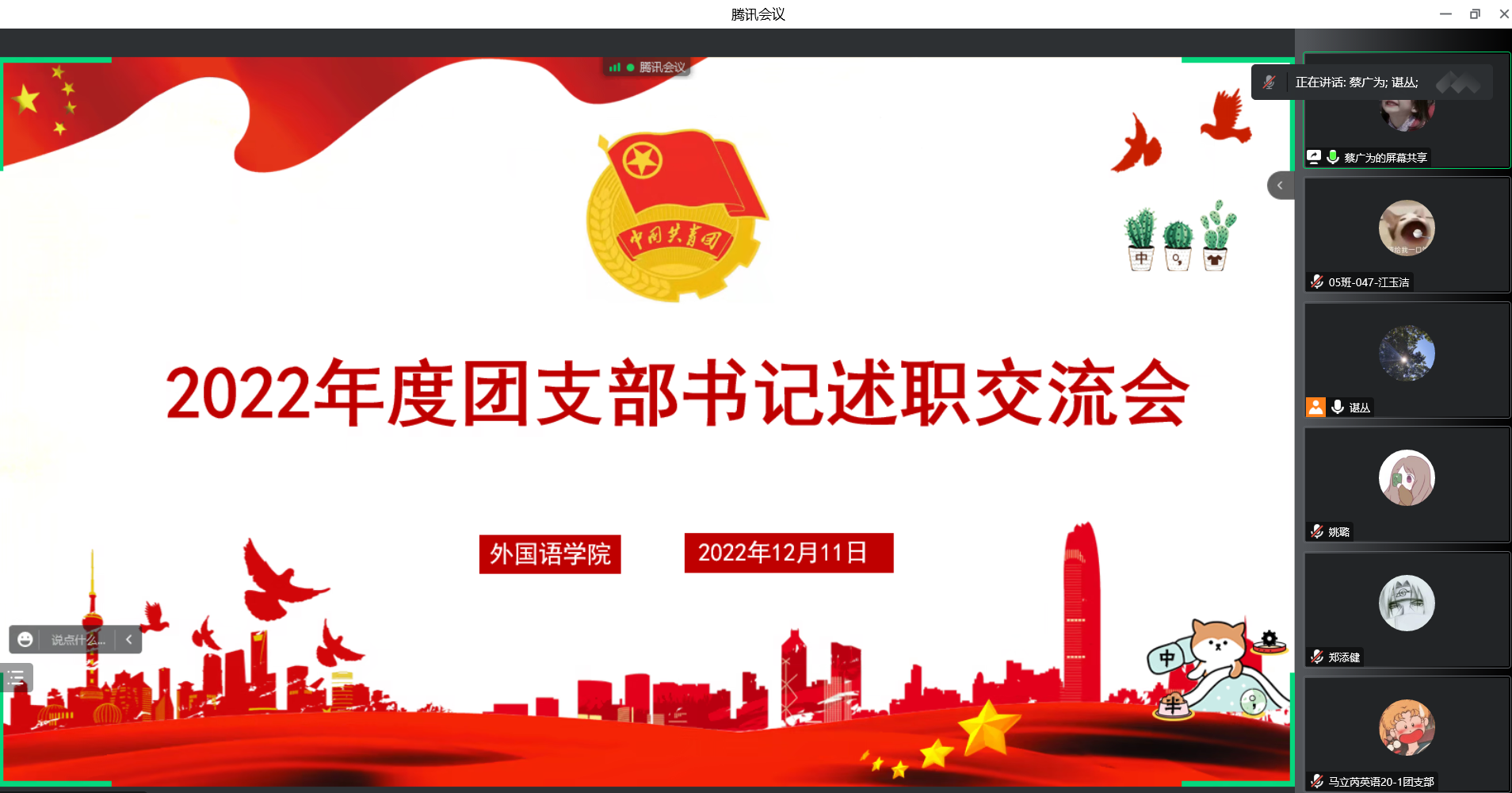 为进一步增强基层团组织的凝聚力,提升班团一体化成效,提高团支部的建设水平,加强团支部之间的学习交流,在疫情特殊时期,外国语学院于12月11日晚上开展团支部述职交流会,院党委副书记刘春阳,院团委书记谌丛,院辅导员老师刘思航、邓泽健、王芃月出席本次会议,同时参会的还有学院各班团的班团骨干代表。