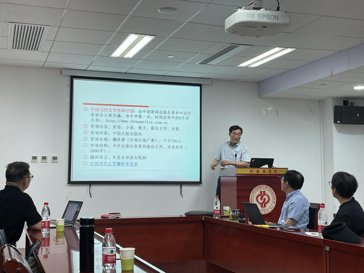 为做好国家社科基金中华学术外译项目的申报动员工作,推动学院科研工作迈上新台阶,7月6日下午,外国语学院邀请北京语言大学吕世生教授和北京外国语大学何明星教授在主楼A822会议室作中华学术外译项目申报指导讲座。讲座由学院副院长崔亚霄主持,学院院长赵秀凤及20余名教师参加讲座。